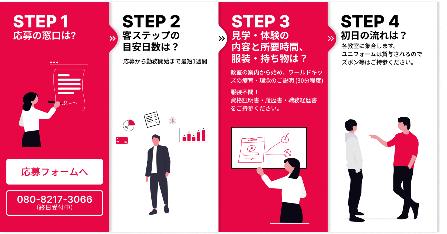 入社祝い金 10万円 地方から上京される方は引っ越し代も負担します! 応募フォームへ ※3月末まで 発達特性に寄り添う“感覚統合×教育”の専門チーム、WORLD KIDSで仲間を募集します。 収入とサポート トレーニング制度 スタッフストーリー一覧 ワールドキッズが 提供する価値 未経験でも専門性が身に付く研修体系 働きやすさ × 専門性 1 未経験でも安心のトレーニング制度 年間離職率 7% (業界平均20〜30%) ワールドキッズは 先生の挑戦 をバックアップします。 入社時すぐに入職時研修を実施し、OJTによる実践育成に進みます。SVや先輩スタッフが日々伴走し、安心してスキルを磨けます。未経験からでも安心。「学びながら成長できる環境」が、ワールドキッズにはあります。 2 働きやすさ × 専門性 定着率70%以上有給取得率80% 産育休復帰率100% 保護者満足度95% ワールドキッズは 先生のワークライフバランスと専門職としての成長 を両立できる環境を提供します。 ワールドキッズでは、月ごとの希望提出制や短時間正社員制度など、ライフスタイルに合わせて柔軟に働ける環境を整えています。感覚統合を取り入れた教室設計と統一フォーマットの保護者対応で、「できた」を積み重ねる支援を実現しています。 収入とサポートを詳しく見る ワールドキッズは経験者・資格取得したい方の支援をしています。経験や強みを活かしながら、現場でのOJTでさらにスキルアップ可能!メインのお仕事としても、副業としての復職希望の方も大歓迎。*ご経験がある方も、研修は同じ内容を受けていただく方針です。 応募から勤務開始までの流れ ワールドキッズの メンバーストーリー ワールドキッズのメンバーの声をご紹介します。 Kさん入店時期2024年度4月前職保育士Yさん入店時期令和6年4月前職児童発達支援管理責任者 応募はこちら 氏名 氏名カナ 生年月日 性別 選択してください 男性 女性 回答しない メールアドレス 電話番号 居住地 応募職種(複数選択可) 児童指導員 保育士 作業療法士 言語聴覚士 公認心理師 事務スタッフ クリックだけで複数選択できます。 保有資格・免許 療育実践の経験 選択してください 未経験 1年未満 1~3年 3年~5年 5年以上 希望勤務地(複数選択可) 新宿教室 水天宮前教室 大森教室 蓮根教室 ひよこ椎名町教室 御苑前教室 浮間舟渡教室 大崎教室 阪東橋教室 大宮教室 光が丘教室 府中教室 南砂町教室 川崎教室(3月OPEN予定) 王子教室(2月新規OPEN予定) 川越教室(2月新規OPEN予定) 田端新町教室(2月新規OPEN予定) 竹ノ塚教室(3月OPEN予定) 下丸子教室(4月OPEN予定) 武蔵関教室【重心型】(4月OPEN予定) クリックだけで複数選択できます。 どこでワールドキッズを知りましたか? ご質問・ご要望などありましたらお書きください 個人情報の取り扱いに同意します 送信する 入社祝い金10万円